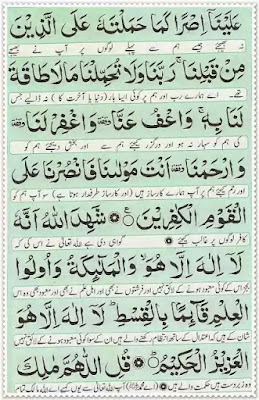 Transliteration: ilayhi min rabbihi waalmu/minoona kullun amana biAllahi wamala-ikatihi wakutubihi warusulihi la nufarriqu bayna ahadin min rusulihi waqaloo samiAAna waataAAna ghufranaka rabbana wa-ilayka almaseeru 286. La yukallifu Allahu nafsan illa wusAAaha laha ma kasabat waAAalayha ma iktasabat rabbana la tu-akhithna in naseena aw akhta/na rabbana wala tahmil